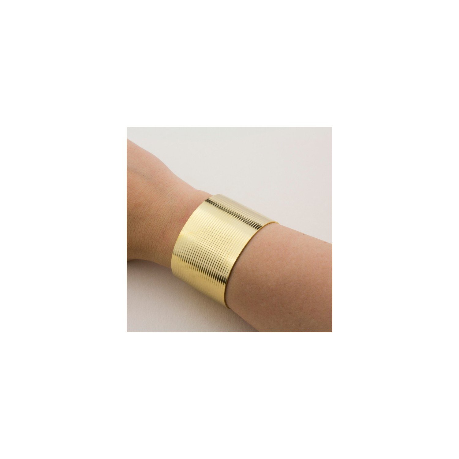 Brazalete de Acero inoxidable en color dorado de estilo minimalista. Diámetro de Ø60 mm aprox. Acabado brillo espejo. Ligeramente ajustable.