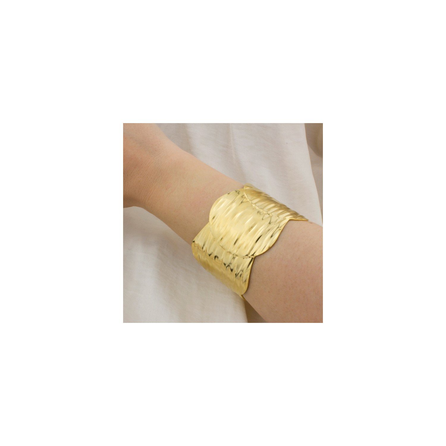 Brazalete XL de Acero inoxidable en color dorado de estilo floral. Diámetro de Ø60 mm aprox. Acabado brillo espejo. Ligeramente ajustable.