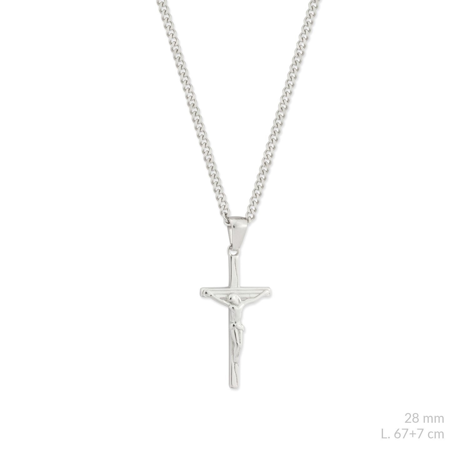 Collar de Acero Inoxidable con crucifijo. Longitud del motivo: 28 mm. Acabado: pulido. Tipo de cadena: barbada. Tipo de cierre: mosquetón. Longitud de 67 cm más cadena de alargamiento de 7 cm. Resistente al sudor, al calor