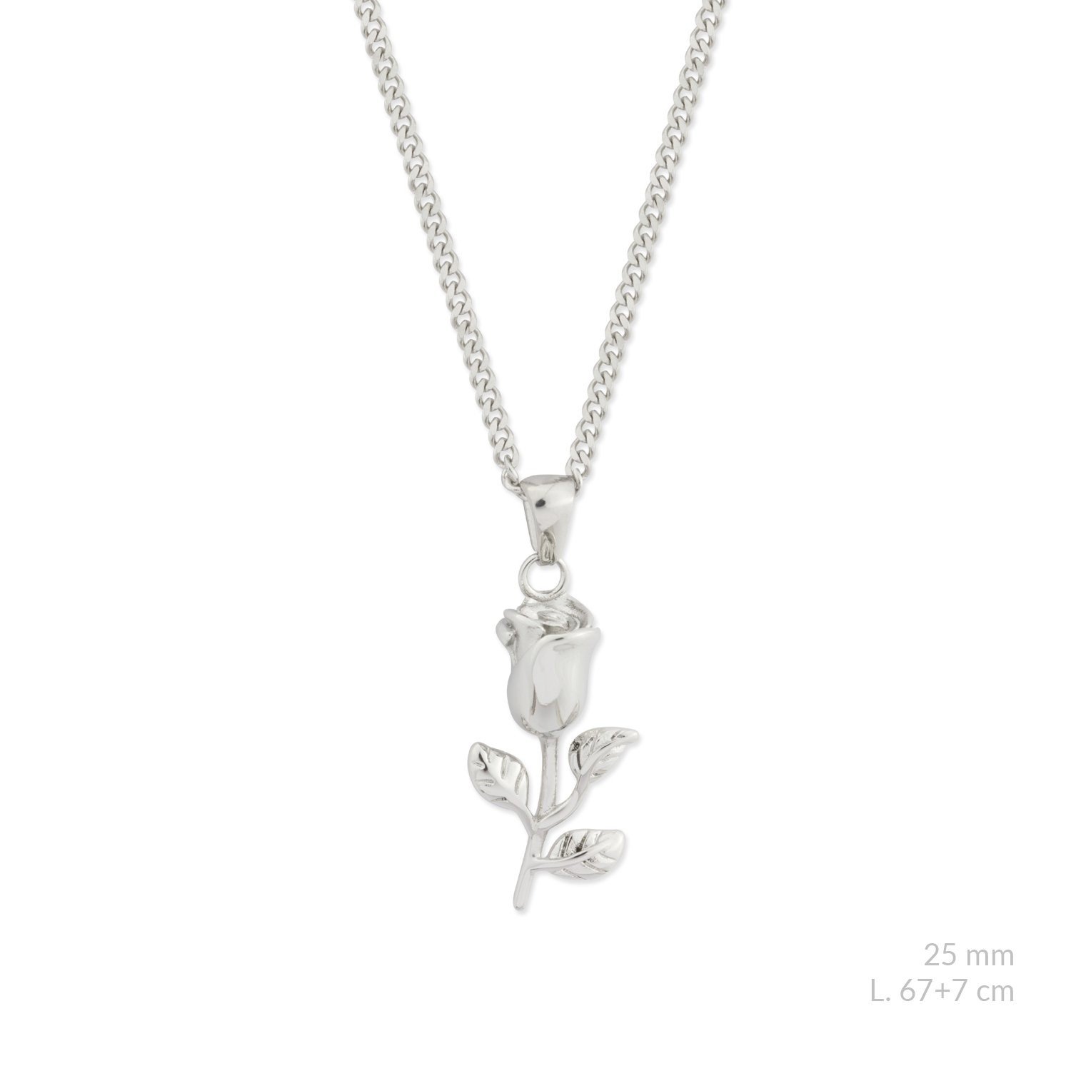 Longitud del motivo: 25 mm. Acabado: pulido. Tipo de cadena: barbada. Tipo de cierre: mosquetón. Longitud de 67 cm más cadena de alargamiento de 7 cm. Resistente al sudor, al calor y a las manchas