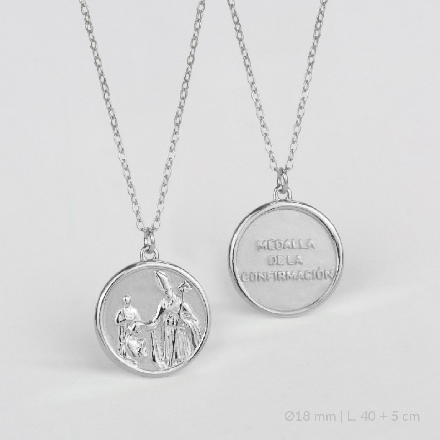 En el anverso podemos ver un exquisito relieve de la escena del sacramento, con un acabado pulido que contrasta con el fondo mate arenado, aportando un contraste que resalta la imagen. En el reverso, tenemos en bajorelieve el texto «Medalla de la Confirmación». La confirmación es el sacramento que confirma la pertenencia del bautizado al mundo de la Iglesia.